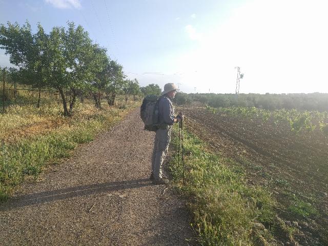 We had breakfast in the Albergue and were out walking before 7am. Once outside the town we walked on dirt and gravel tracks as yesterday and through fields, olive groves and vineyards. The ground under the vines and olive trees is bare and cultivated. Several days ago grass grew under the trees and near the vines. Now, we see tractors disking the ground and it seems it’s drier and there’s no grass or weeds. We entered the next village after ~4km and were almost out the other side before finding a small bar open and had a coffee. The next 15km to our destination of Villafranca de los Barros was more of the same terrain and fields. We got the last two beds at Albergue El Carmen, a nice private albergue. After unpacking and relaxing we had lunch at a nearby square. Glenn and I had half-liters of beer and “hamberguesa”. I’ve resisted ordering hamburgers in Spain for obvious reasons. However, they are so different than anything we see in USA I guess it’s okay. I wrote on a facebook post of the sandwich that “Spain puts the ham in hamburger”. There’s no beef at all. This one had a large bun, two patties of pork, bacon, jamon, cheese, and york (like our sliced ham). We each had one but should have split one. For dinner we will simply have an apple and a bottle of wine. Tomorrow is a longish day of ~28km and we are both footsore - i have two blisters and Glenn’s feet are tender. So, we’ll take it slow and I’ve used Booking.com to reserve a room at our destination. We’ll still start as early as possible to beat the heat but can take it slowly as needed.